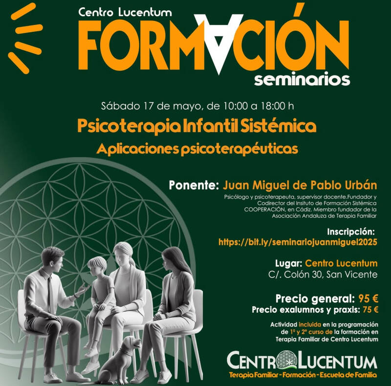 El próximo mes de mayo, los días 16 y 17, estaré en el Centro Lucentum de Alicante, invitado para impartir un seminario sobre PSICOTERAPIA INFANTIL SISTÉMICA: APLICACIONES PSICOTERAPÉUTICAS durante el sábado 17, dirigido al alumnado y a los profesionales. Mi agradecimiento a Yolanda Mendívil y al Centro Lucentum por contar conmigo de nuevo.