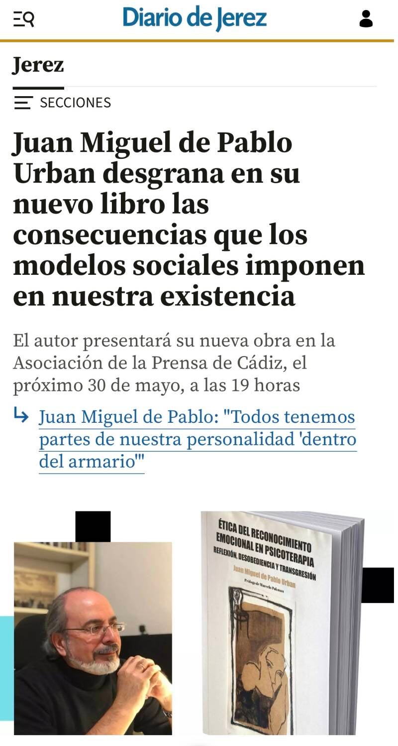 En Diario de Jerez, 27 de mayo de 2025, se ha publicado un artículo sobre “Ética del reconocimiento emocional en psicoterapia. Reflexión, desobediencia y transgresión”, donde se informa de la presentación que realizaré el próximo viernes 30, a las 19,00 horas, en la Asociación de la Prensa de Cádiz.