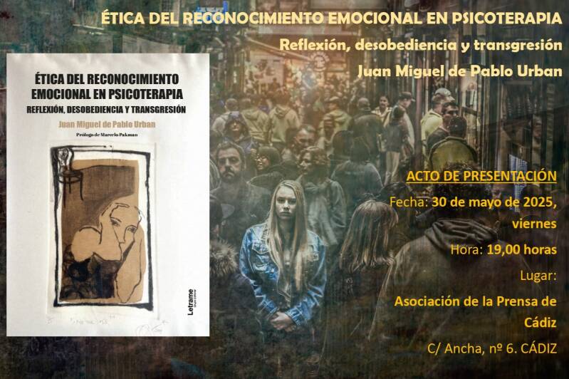 Vídeo de la presentación de ÉTICA DEL RECONOCIMIENTO EMOCIONAL EN PSICOTERAPIA. REFLEXIÓN, DESOBEDIENCIA Y TRANSGRESIÓN (2025), de Juan Miguel de Pablo Urban, con la colaboración de Conchi Rea e Inés Vicente, en la Asociación de la Prensa de Cádiz, el viernes, 30 de mayo de 2025.
