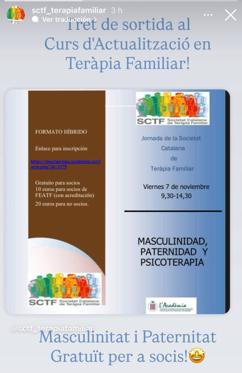 El próximo 7 de noviembre, viernes, impartiré en Barcelona un seminario con el título “Masculinidad, paternidad y psicoterapia”, invitado por la Sociedad Catalana de Terapia Familiar. Mi agradecimiento a Jose Soriano y a la SCTF por la invitación. 🙏