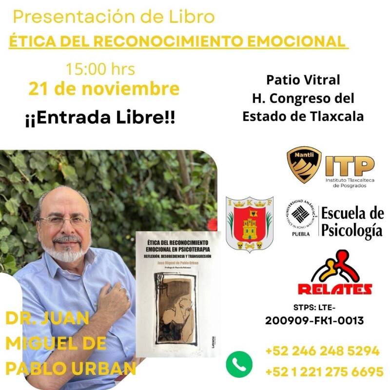 Mi agradecimiento a la Dra. Maru Figueroa y al Instituto Tlaxcalteca de Posgrados, NANTLI, por invitarme a México para la presentación de mi último libro, la asistencia como ponente a unas jornadas y la realización de un taller sobre la persona del terapeuta. Todo un honor 🙏
