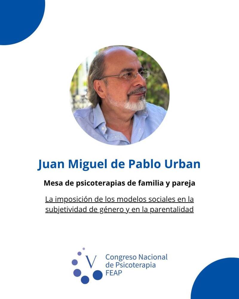 📢 Juan Miguel de Pablo Urban será ponente en la mesa de psicoterapias de familia y pareja, en la que también participarán María José Durán y Virginia Cagigal de Gregorio. Su ponencia se titula "La imposición de los modelos sociales en la subjetividad de género y en la parentalidad"
